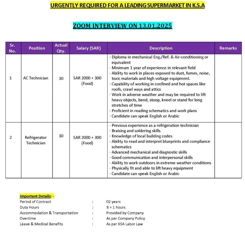 AC Technicians and Refrigerator Technicians wanted for a leading supermarket in Saudi Arabia