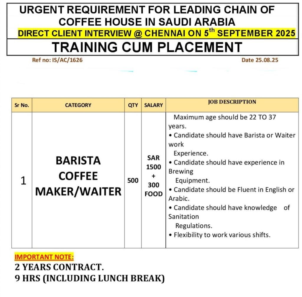 Barista Coffee Maker/Waiter Wanted For Leading Chain Of Coffee House In Saudi Arabia