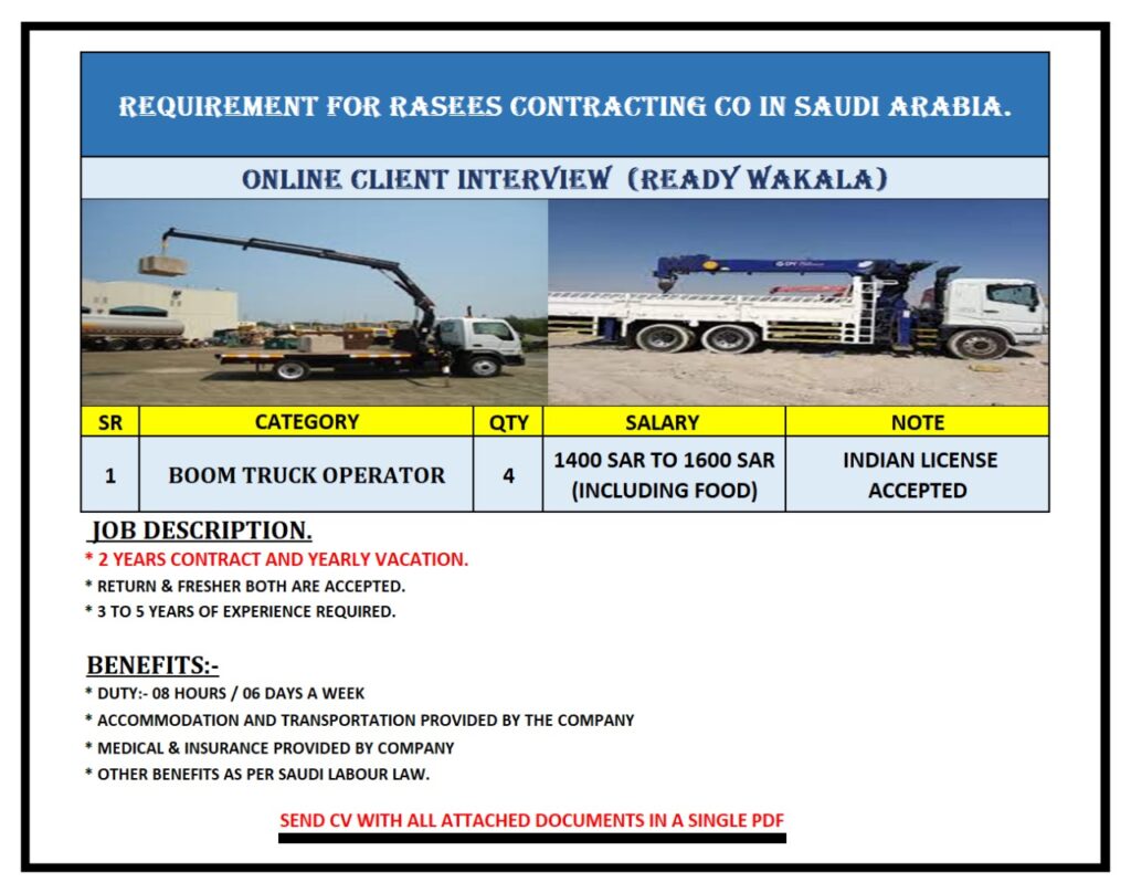 Boom Truck Operator Wanted For Rasees in saudi Arabia