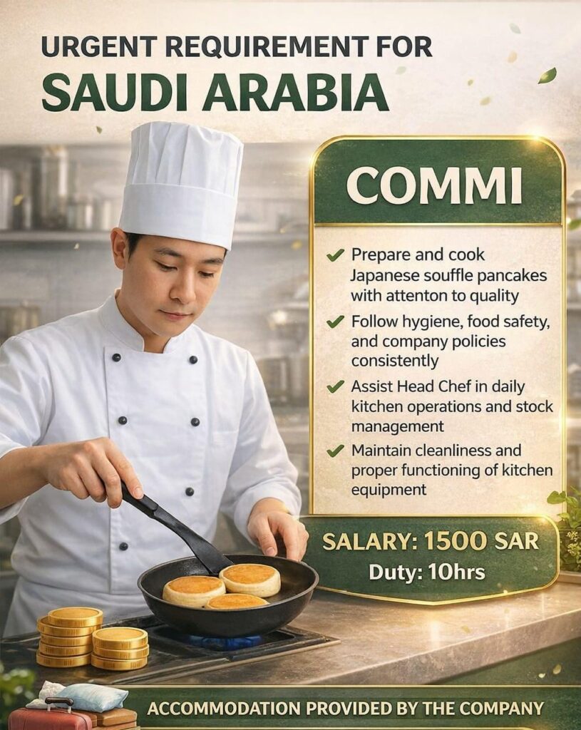 Job Description: ✔ Assist Head Chef in daily kitchen operations and stock management ✔ Maintain cleanliness and proper functioning of kitchen equipment ✔ Prepare and cook Japanese souffle pancakes with attention to quality ✔Follow food hygiene and safety measures