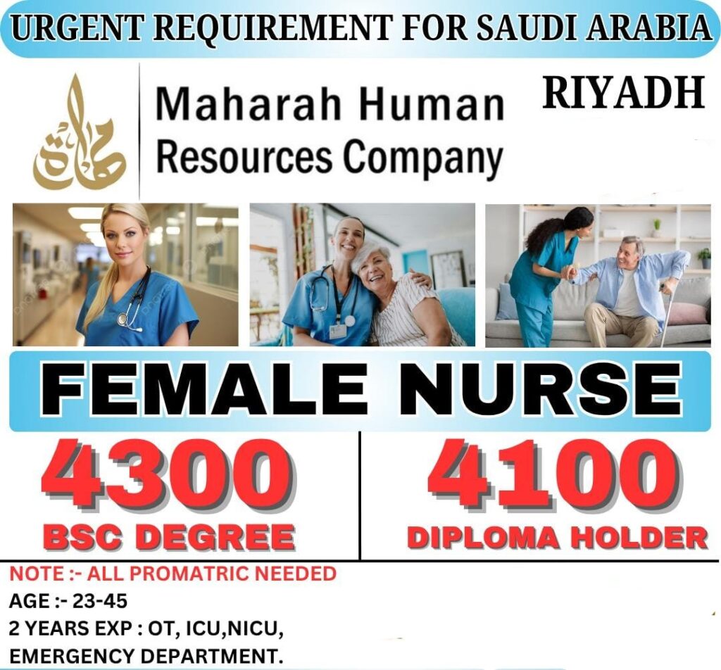 Female Nurse Wanted for Maharah Human Resources Company In Saudi Arabia