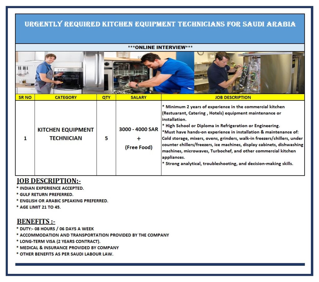 Kitchen Equipment Technicians Wanted for Saudi Arabia
