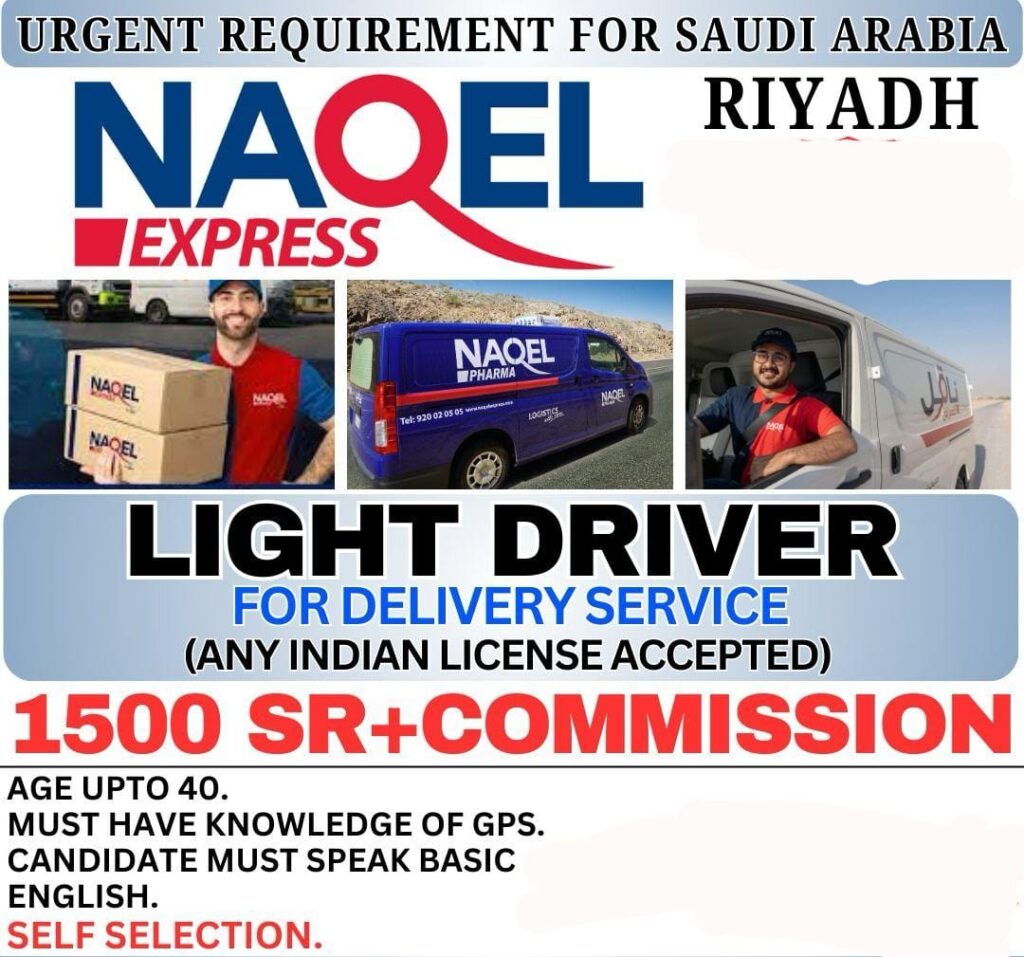 Job Description: Candidates currently in India can only apply Light Driver for Delivery Service Wanted for Naqel Express in Saudi Arabia