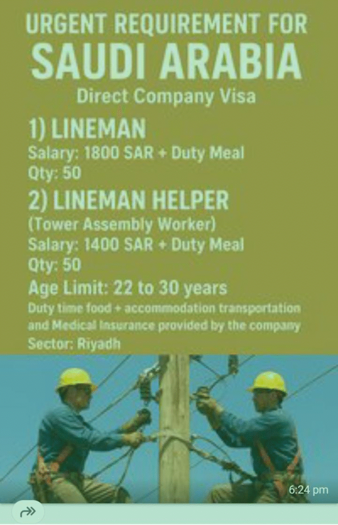 Lineman / Lineman Helper Wanted for Saudi Arabia