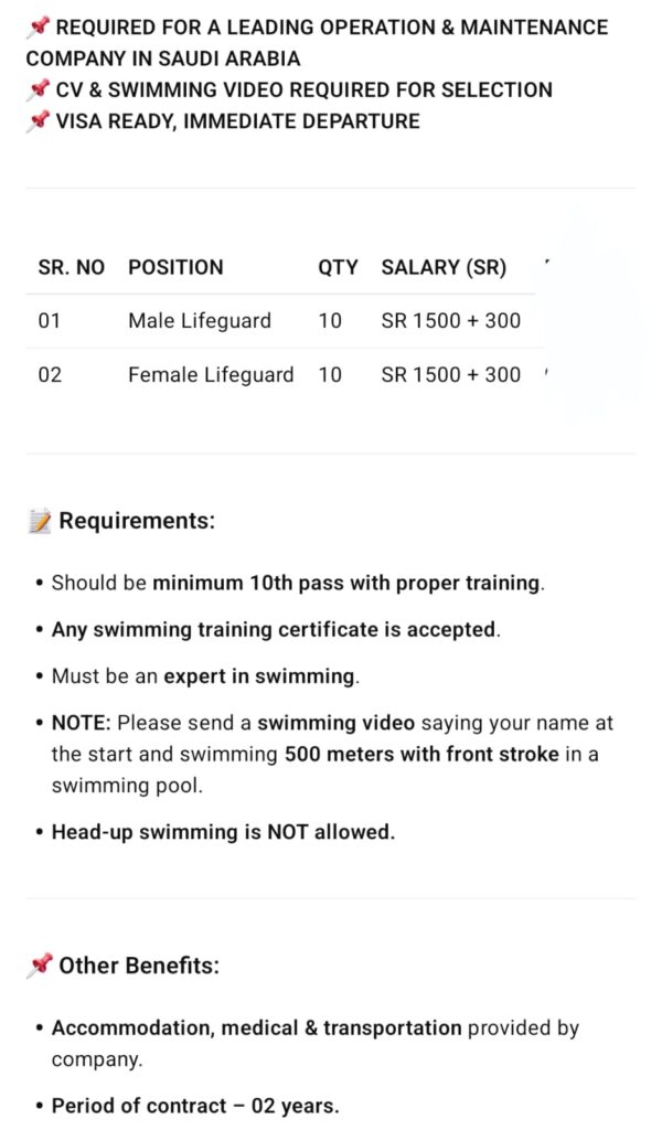 Male Lifeguard/Female Lifeguard Wanted For A Leading Corporation & Maintenance Company In KSA