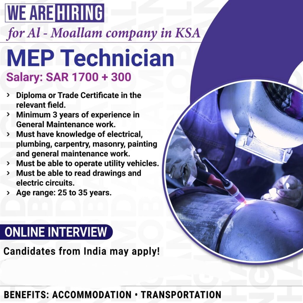 MEP Technician Wanted For Al – Moallam Company In Saudi Arabia