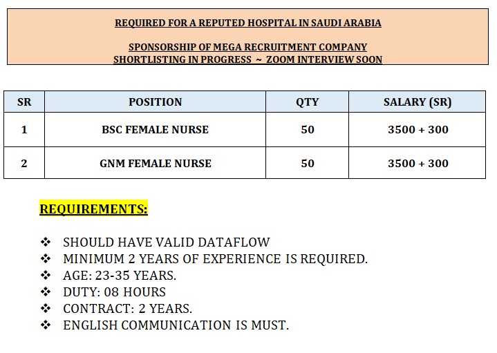 Nurses wanted for a reputed hospital in Saudi Arabia under sponsorship of Mega recruitment company.