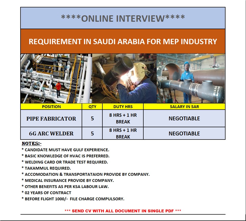 Pipe Fabricator/6G ARC Welder Wanted For Saudi Arabia