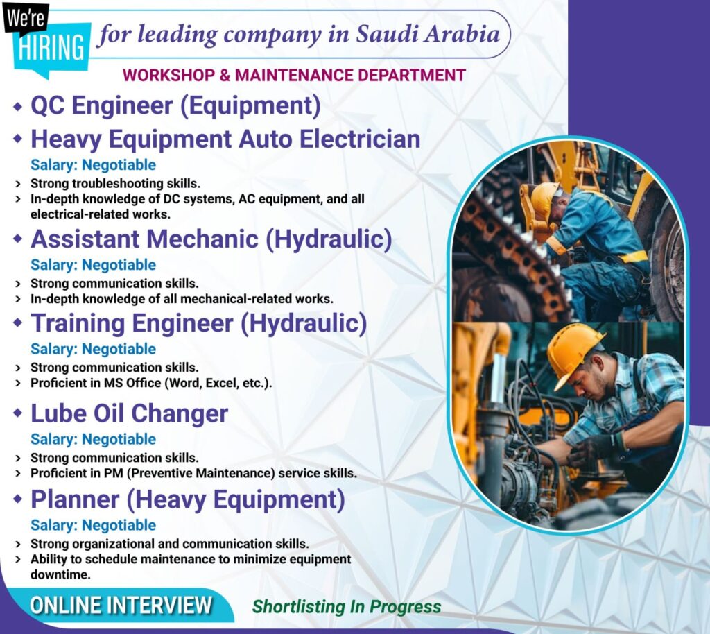 QC Engineer (Equipment)/Heavy Equipment Auto Electrician/Asst. Mechanic(Hydraulic)/Training Engineer (Hydraulic)/Lube Oil Changer/Planner(Heavy Equipment Wanted For Saudi Arabia