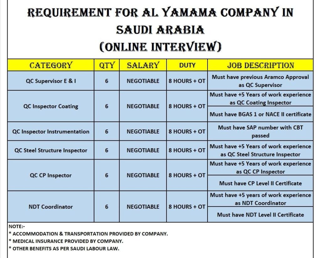 Job Description: QC Technicians wanted for Al Yamama company in saudi arabia