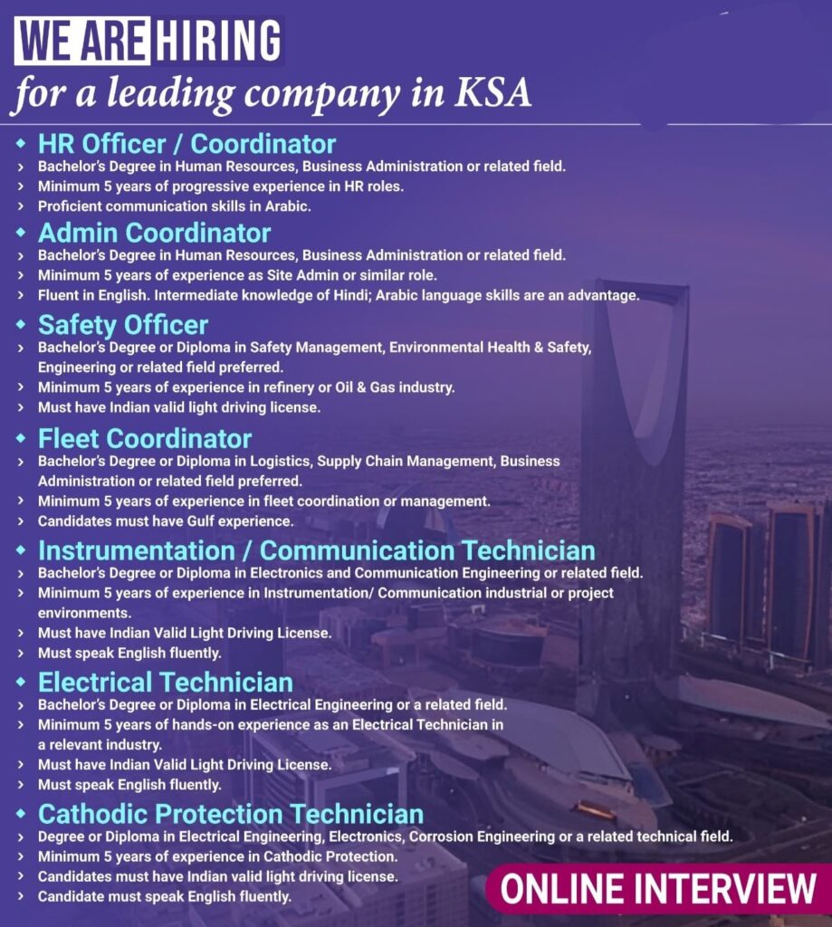 Job Category: Admin/Coordinator) Cathodic Protection Technician Electrical Technician Fleet Coordinator HSE officer/Coordinator Instrumentation / Communication Technician safety officer