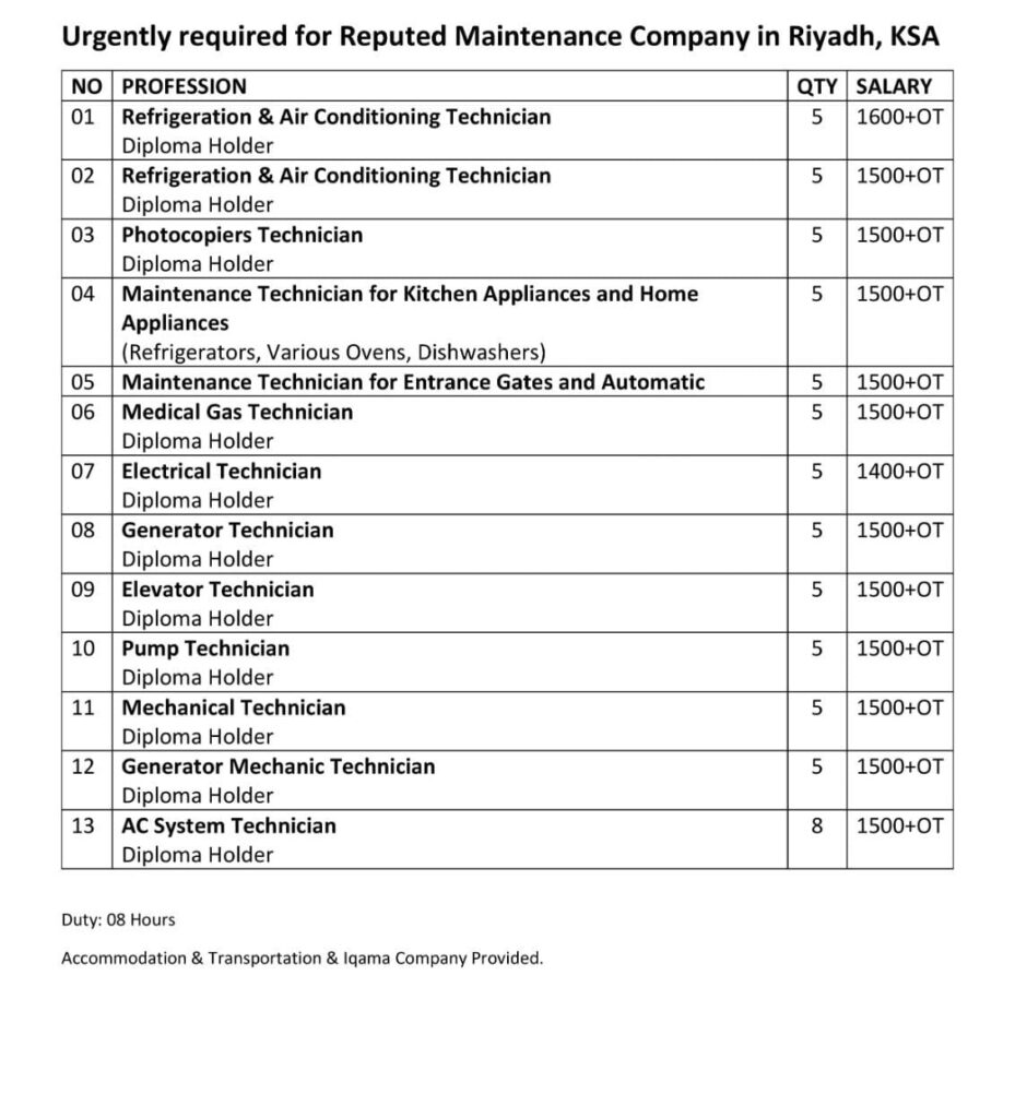 Job Category: AC System Technician (Diploma Holder) Electrical Technician (Diploma Holder) Elevator Technician (Diploma Holder) Generator Mechanic Technician (Diploma Holder) Generator Technician (Diploma Holder) Maintenance Technician for Entrance Gates and Automatic Maintenance Technician for Kitchen Appliances and Home Appliances Mechanical Technician (Diploma Holder) Medical Gas Technician (Diploma Holder) Photocopiers Technician (Diploma Holder) Pump Technician (Diploma Holder) Refrigeration & Air Conditioning Technician (Diploma Holder)