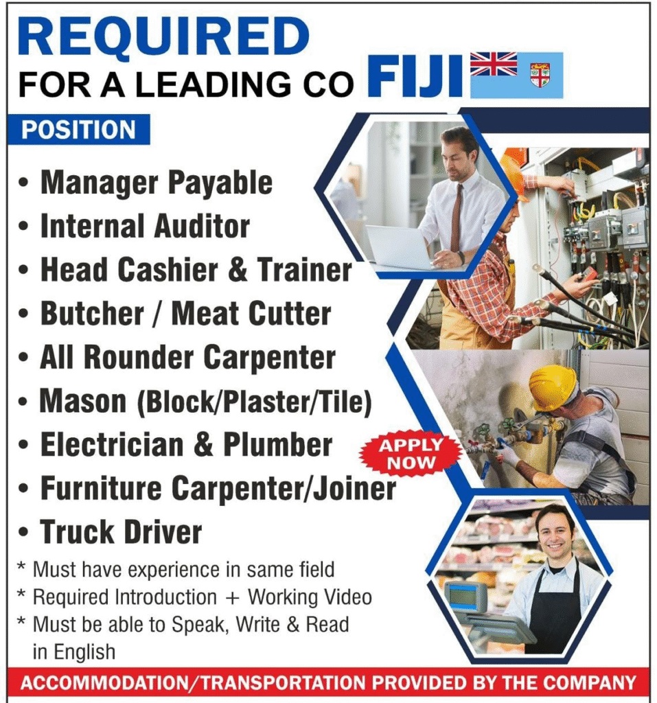 Job Description: Candidates currently in India can only apply Requirement for A Leading Company In Fiji