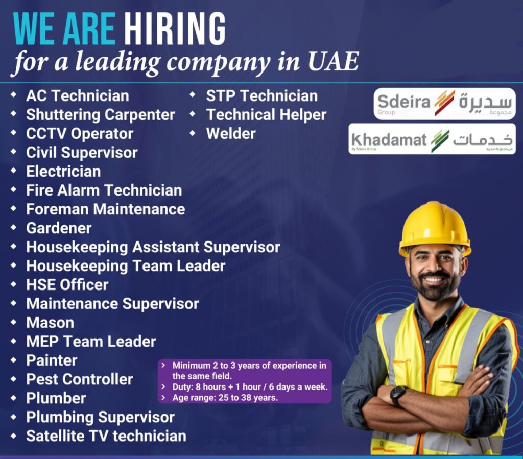 Job Category: AC Technician CCTV Operator Civil Supervisor Electrician Fire Alarm Technician Foreman Maintenance Gardener Housekeeping Assistant Supervisor Housekeeping Team Leader HSE officer Maintenance Supervisor Mason MEP Team Leader Painter Pest Controller plumber Plumbing Supervisor Satellite TV technician Shuttering Carpenter STP Technician Technical Helper welder