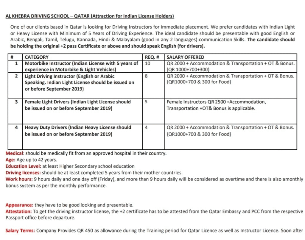 Job Description: Candidates currently in India can only apply Requirement for Al Khebra Driving School in Qatar