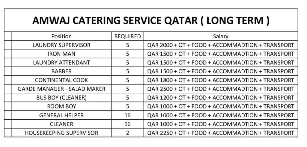 Job Description: Candidates currently in India can only apply REQUIREMENT FOR AMWAJ CATERING SERVICE IN QATAR