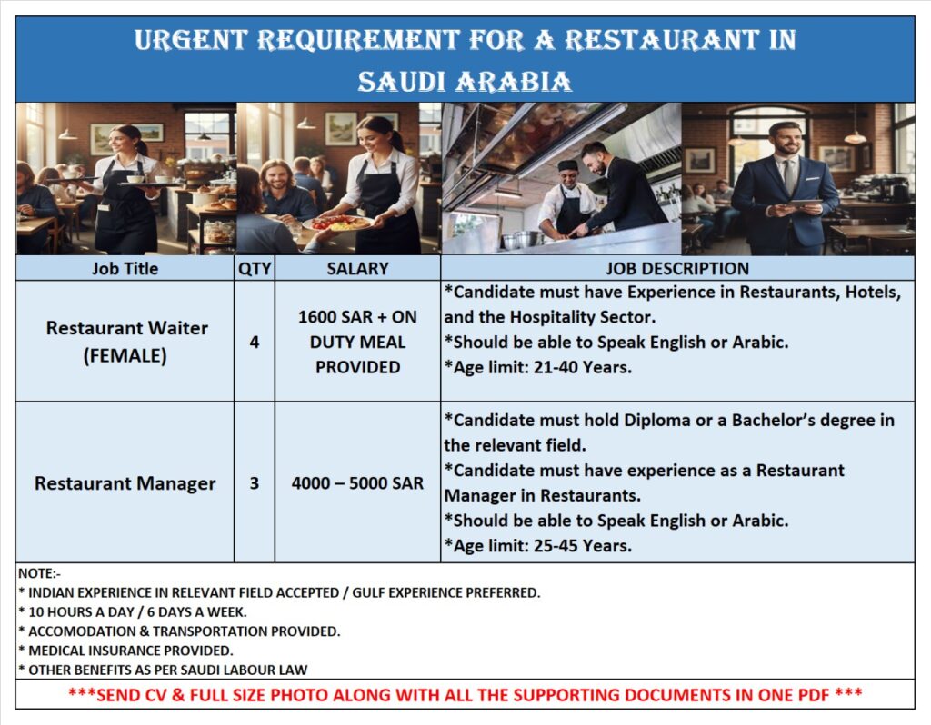 Restaurant Waiter (Female)/ Restaurant Manager Wanted for a Restaurant in KSA