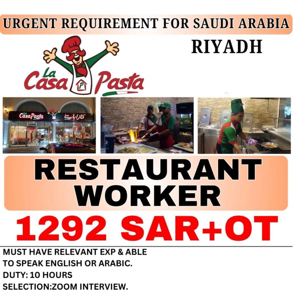Restaurant Worker Wanted for La Casa Pasta In Saudi Arabia