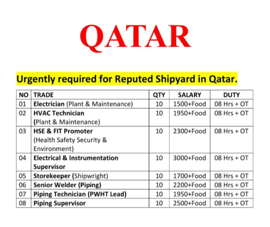 Job Description: Technicians & supervisors wanted for a shipyard in qatar